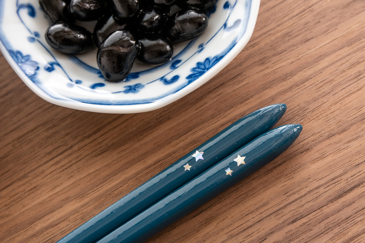 青色には星、ピンク色にはハートの模様が付いているかわいらしい箸。子どもサイズもあり、親子でおそろいで使うのもおすすめです。
