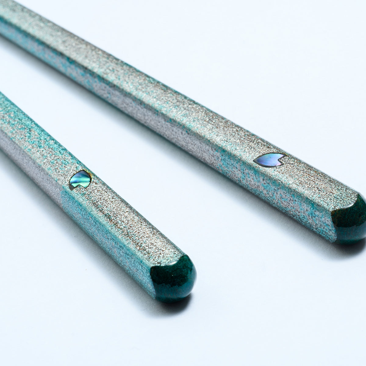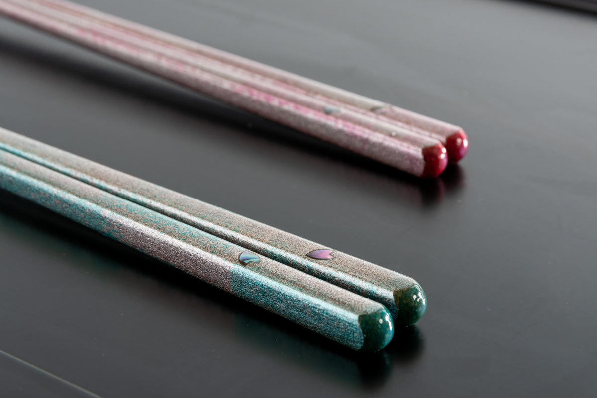 ベースのキラキラとした輝きに、漆地に貝殻をのせて研ぎ出す伝統的な技法「螺鈿(らでん)」加工を施したサクラの花びらがスペシャルな箸。
