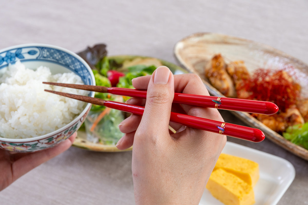 若狭塗り箸とは、福井県小浜市で生産される漆器「若狭塗」の技法で作られるお箸です。漆を塗り重ねた木地に卵殻や貝殻で模様をつけ、その上から様々な色の漆を塗り重ねて、最後に研磨して模様に浮き立たせるのが特徴ですが、最近は美しい螺鈿をごくワンポイントに入れたシンプルなデザインや、自然の木に近い素朴な塗り箸が人気です。