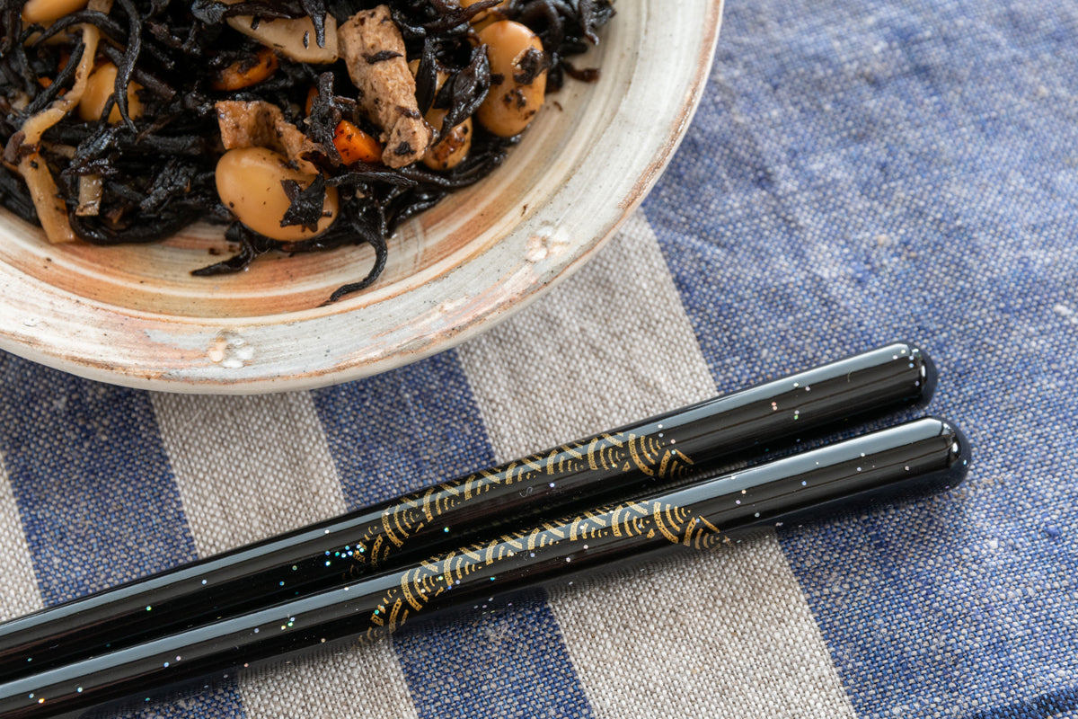 若狭塗り箸とは、福井県小浜市で生産される漆器「若狭塗」の技法で作られるお箸です。漆を塗り重ねた木地に卵殻や貝殻で模様をつけ、その上から様々な色の漆を塗り重ねて、最後に研磨して模様に浮き立たせるのが特徴ですが、最近は美しい螺鈿をごくワンポイントに入れたシンプルなデザインや、自然の木に近い素朴な塗り箸が人気です。